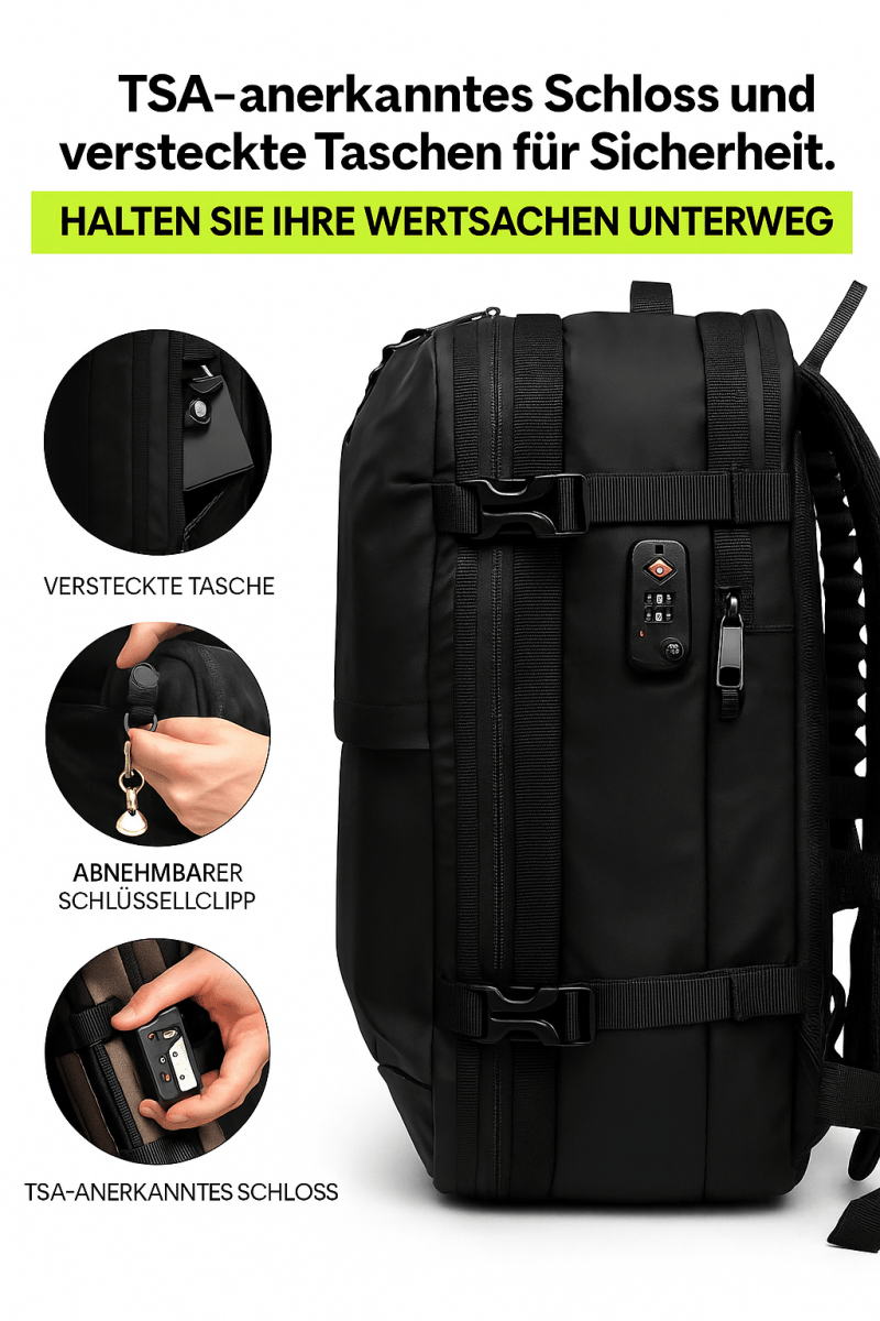 Ja, ein integriertes TSA-Zahlenschloss mit Metallreißverschluss schützt dein Gepäck – ideal für Flugreisen.